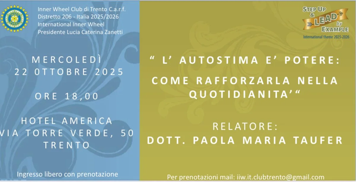 L’appuntamento, organizzato da Inner Wheel Club di Trento (Distretto 206 – Italia), fa parte del ciclo di incontri dedicati alla crescita personale e al benessere interiore. Durante la serata si parlerà di come riconoscere il proprio valore, rafforzare la fiducia in sé e gestire le sfide quotidiane con maggiore consapevolezza.